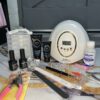 Alicate, Repujador, corta tips, cepillo para retirar polvo, corta tips, dappen de vidrio, pinzas para poly.